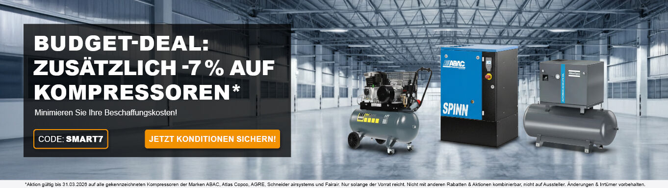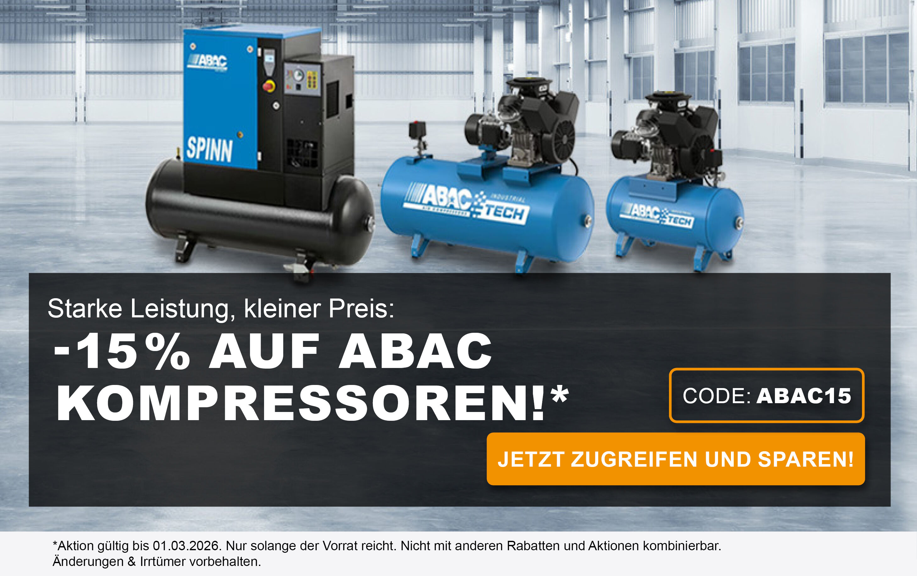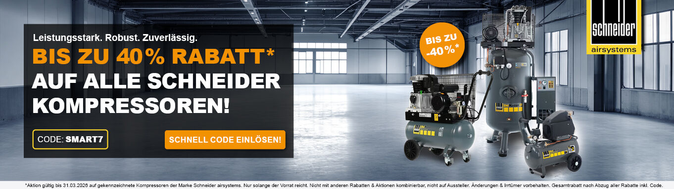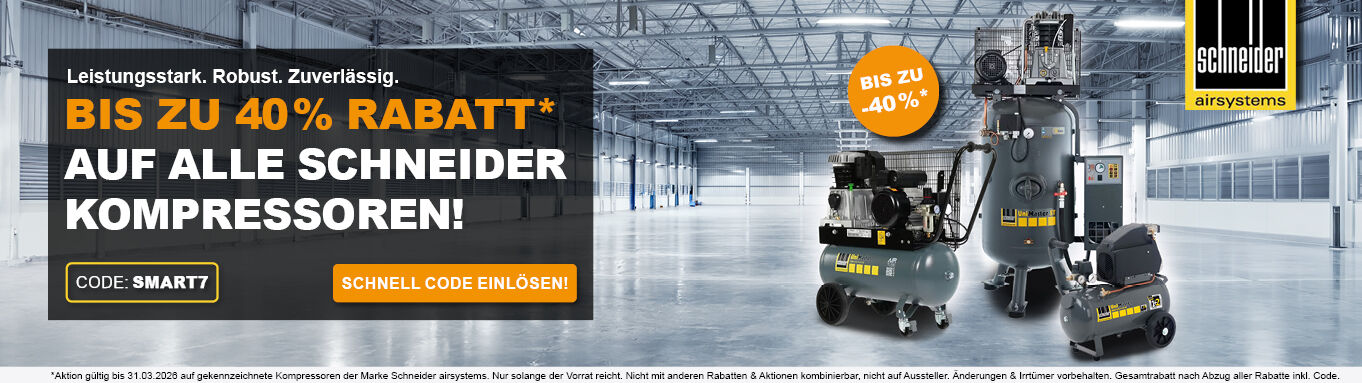 Als Druckluft Shop bieten wir Ihnen an 365 Tagen im Jahr ein umfangreiches Produktspektrum rund um die Druckluft an. Sie finden bei uns Kompressoren, Druckluft-Werkzeuge und vieles mehr von bekannten Qualitätsherstellern der Druckluft-Branche. Zu unseren Lieferanten zählen namhafte Firmen, wie Renner Kompressoren, Schneider Druckluft, Prebena, Jun-Air, Riegler, Rodcraft, Prevost, Gentilin und Condor. Unser Online-Fachhandel bietet Ihnen über 200.000 Produkte in folgenden Kategorien: